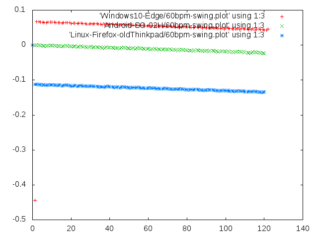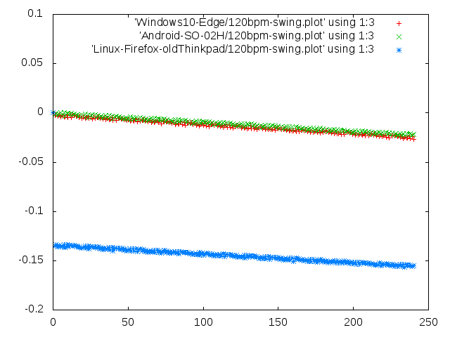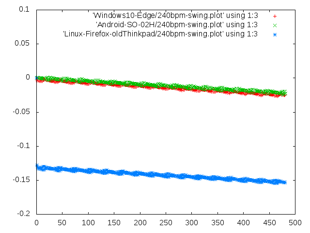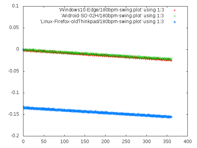 X: note number, Y (actual playback time) - (theoretical ideal time) in sec